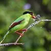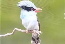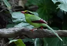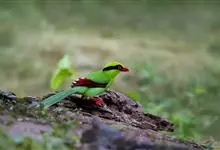 蓝绿鹊:中型鸟类,共有5个亚种。体长36-38厘米。尾长,嘴、脚红色。通体羽色主要为草绿色,宽阔的黑色贯眼纹向后延伸到后颈,在绿色的头侧极为醒目。两翅栗红色,内侧飞羽具黑色次端斑和白色尖端。尾绿色,…全部>>