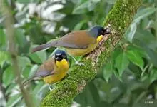黄喉噪鹛体型略小,顶冠蓝灰色,特征为具黑色的眼罩和鲜黄色的喉。上体褐色,尾端黑色而具白色边缘,腹部及尾下覆羽皮黄色而渐变成白色。黄喉噪鹛隐匿于亚热带常绿林和浓密灌丛,于地面杂物中取食,喜食昆虫,…全部>>