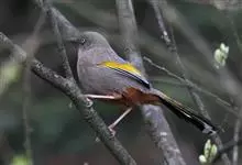 橙翅噪鹛:是噪鹛科、彩翼噪鹛属的中型鸟类,体长22-25厘米。头顶深葡萄灰色或沙褐色。上体灰橄榄褐色,外侧飞羽外翈蓝灰色、基部橙黄色,中央尾羽灰褐色,外侧尾羽外翈绿色而缘以橙黄色并具白色端斑。…全部>>