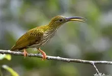 纹背捕蛛鸟:为太阳鸟科捕蛛鸟属的鸟类。是太阳鸟科中体型较大的一种,体重25-45克,体长160-210毫米。嘴粗长而尖且向下弯曲。上体橄榄黄色具黑色中央斑纹。下体淡黄白色满布黑色纵纹,尾具黑色次端斑。…全部>>