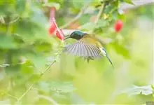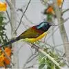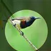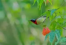 绿喉太阳鸟:共有9个亚种。小型鸟类,雄鸟体长13-15厘米、雌鸟10-12厘米。雄鸟前额至后颈、颏和喉辉绿色,头侧黑色,颈侧和背暗红色,两肩、下背橄榄绿色,腰鲜黄色,尾上覆羽和中央尾羽暗绿色,…全部>>
