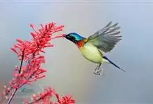 火尾太阳鸟为太阳鸟科太阳鸟属的鸟类。体长20厘米,色彩艳丽。雄鸟红色,具形长的艳猩红色中央尾羽。头顶金属蓝色,眼先和头侧黑色,喉及髭纹金属紫色。下体黄色,胸具艳丽的橘黄色块斑。雌鸟灰橄榄色,腰黄,…全部>>