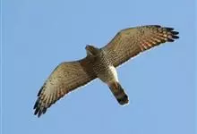 褐耳鹰的体形比苍鹰要小得多,为小型猛禽,体长为31-44厘米,体重217-325克。上体灰色,下体具赤褐色横斑。第6枚初级飞羽外羽片无缺刻,次外侧的4对尾羽具5道黑褐色横斑。眼先具白色短羽。…全部>>