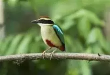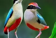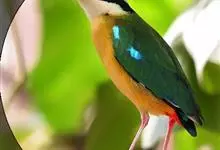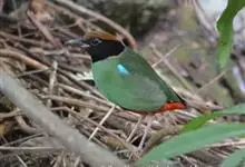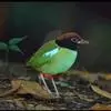 绿胸八色鸫:是雀形目八色鸫科的鸟类,共有12个亚种。体长为16-18厘米,体重65-69克。体型圆胖,尾短,腿长。头黑,上体绿色,两翼深色而具白色斑纹,头顶至后枕深褐,胸及腹部苹果绿,臀亮红。…全部>>