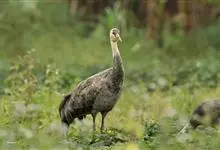 东非冕鹤是大型涉禽。体长127厘米。额部向外凸出,有乌黑色绒羽,枕部有由无数条土黄色绒丝向四周放射所形成的绒球状冠羽。眼睛后方的面颊有上红下白的斑块。颈长。喉部有红色肉垂。体羽主要为浅蓝灰色,…全部>>