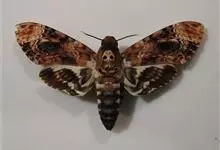 鬼脸天蛾,是鳞翅目天蛾科面形天蛾属动物。成虫翅展100~125毫米,体黑褐色;胸背有骷髅形斑纹;卵圆球形,直径约2毫米,淡黄绿色,表面光滑;老熟幼虫体长70~90毫米,蛹体长约56毫米;前翅为褐色,…全部>>
