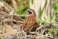 黑顶麻雀:为雀科麻雀属的鸟类。体重24-35克,体长144-167毫米,是一种中等体型的麻雀。繁殖期雄鸟头顶有黑色的冠顶纹至颈背,眼纹及颏黑,眉纹及枕侧棕褐,脸颊浅灰。上体褐色而密布黑色纵纹。…全部>>
