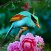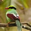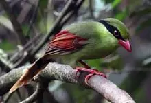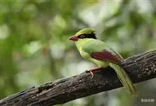蓝绿鹊:中型鸟类,共有5个亚种。体长36-38厘米。尾长,嘴、脚红色。通体羽色主要为草绿色,宽阔的黑色贯眼纹向后延伸到后颈,在绿色的头侧极为醒目。两翅栗红色,内侧飞羽具黑色次端斑和白色尖端。尾绿色,…全部>>