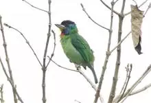 金喉拟啄木鸟,是须鴷科、拟啄木鸟属的鸟类。金喉拟啄木鸟为小型鸟类,体长19-24厘米。额深红色,头顶金黄色,后枕具一大块深红色斑,耳羽和头侧银灰色,上体草绿色,颏和上喉金黄色,下喉淡银灰色,…全部>>