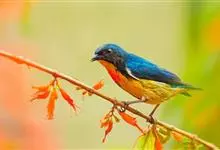 红胸啄花鸟:体重5-10克,体长60-92毫米。体形纤小。雄鸟上体呈辉亮的金属绿色;下体棕黄,胸部具一朱红色块斑,极易与其他啄花鸟区别。雌鸟上体呈橄榄绿,下体棕黄色。虹膜褐色,嘴褐黑色或角灰色,…全部>>