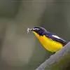 白眉姬鹟是小型鸟类,体长11-14厘米。雄鸟上体大部黑色,眉纹白色,在黑色的头上极为醒目。腰鲜黄色,两翅和尾黑色,翅上具白斑。下体鲜黄色。雌鸟上体大部橄榄绿色。腰鲜黄色,翅上亦具白斑。下体淡黄绿色。…全部>>