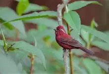 酒红朱雀小型鸟类,体长13~15厘米。雄鸟通体深红色,头部深朱红或棕红色,下背和腰玫瑰红色,眉纹粉红色而具丝绢光泽。两翅和尾黑褐或灰褐色、具暗红色狭缘,内侧两枚三级飞羽具淡粉红色先端。…全部>>