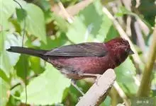 酒红朱雀小型鸟类,体长13~15厘米。雄鸟通体深红色,头部深朱红或棕红色,下背和腰玫瑰红色,眉纹粉红色而具丝绢光泽。两翅和尾黑褐或灰褐色、具暗红色狭缘,内侧两枚三级飞羽具淡粉红色先端。…全部>>