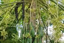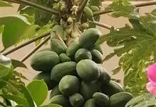 番木瓜,番木瓜科番木瓜属的常绿软木质小乔木,高达10米,具有乳汁;茎不分枝或有时于损伤处分枝;叶大且聚生于茎顶,近似盾形,叶柄中空;花单性或两性,有些品种雄株偶尔生两性花或雌花,…全部>>