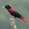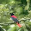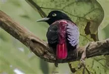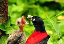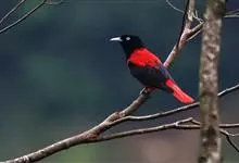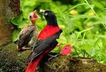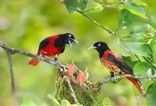 朱鹂:中等鸟类,体长23-28厘米。雄鸟绛紫红色,头、上胸及翼黑色。雌鸟上背及背部深灰色,尾覆羽及尾绛紫红色,腹部及下胸白而密布黑色纵纹。与鹊色鹂幼鸟的区别在上背灰色较深,下体白色较少且纵纹较粗。…全部>>