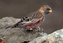 粉红腹岭雀:为燕雀科岭雀属的鸟类。体重25-34克,体长150-182毫米。是一种中等体型的深色岭雀。两翼及下体玫红色。东北亚种的雄鸟额、顶冠及脸灰;上背黄褐;上体深褐,…全部>>