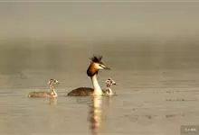 凤头鸊鷉:体长为50厘米以上,体重为0.5-1千克。前额和头顶部黑褐色,枕部两侧的羽毛往后延伸,分别形成束羽冠。脚的位置几乎处于身体末端,尾羽短而不显,趾侧有瓣蹼。瓣蹼十分发达,除了适于游水之外,…全部>>