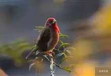 普通朱雀是雀形目雀科朱雀属鸟类,又名红朱雀、马料、青麻料。雄鸟上体红色,下体淡红色;头部、喉部、胸部及腰部亮红色;背部褐色染红色;两翼及尾黑褐色,羽缘染红色。雌鸟上体橄榄褐色,下体近白色,…全部>>