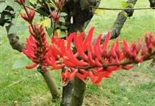龙牙花是豆科刺桐属小乔木或灌木植物。株高可达3-5米;树干和分枝有散生皮刺;羽状复叶具3小叶,叶柄无毛,有时有下弯的刺,小叶菱状卵形,先端渐尖而钝或长渐尖,基部宽楔形,两面无毛,…全部>>