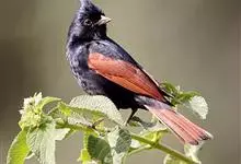 凤头鹀:属小型鸣禽,体重21-31克,体长134-175毫米。以头顶的细长羽冠为特征,雄鸟全身几乎均为黑色具蓝色光泽,两翅和尾以及尾上覆羽栗红色。雌鸟具短的褐色羽冠,上体暗橄榄褐色,…全部>>