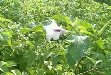 洋金花是茄科曼陀罗属植物,一年生草本植物,全株近于无毛。茎直立,圆柱形,高30~100cm,基部木质化,上部呈义状分枝。叶互生,上部的叶近于对生;叶柄长2~6cm,表面被疏短毛;叶片卵形、长卵形或心形,…全部>>