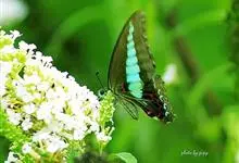 青带凤蝶Graphium sarpedon ,又名青凤蝶,是最普遍的中型凤蝶,飞行速度很快。青带凤蝶的翅膀中央有许多浅蓝色的斑点,很整齐地排列成一条直线。这些斑点由上而下逐渐变大,就像一条青色的带子。全部>>
