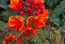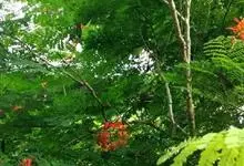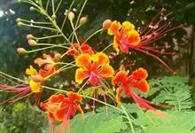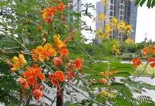 洋金凤 Sw.),豆科小凤花属灌木状或小乔木植物,枝无毛,绿或粉绿色;二回羽状复叶;总状花序伞房状,萼片无毛,花瓣橙红或黄色,圆形,花丝红色,子房无毛,花柱橙黄色;荚果窄而薄,…全部>>
