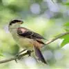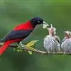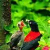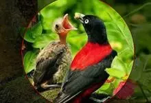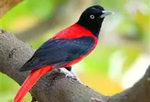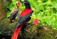 朱鹂:中等鸟类,体长23-28厘米。雄鸟绛紫红色,头、上胸及翼黑色。雌鸟上背及背部深灰色,尾覆羽及尾绛紫红色,腹部及下胸白而密布黑色纵纹。与鹊色鹂幼鸟的区别在上背灰色较深,下体白色较少且纵纹较粗。…全部>>