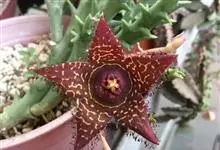 巨花犀角又称大豹皮花,是夹竹桃科犀角属的一种植物。茎粗,花大,边缘生长细毛。植株柱形多分枝呈丛生,柱形具4棱,棱缘具细小疣突。花大,五角星形黄色,并有横向棕褐色斑纹,似豹皮而得名。花期夏秋两季。…全部>>