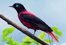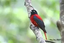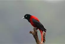 朱鹂:中等鸟类,体长23-28厘米。雄鸟绛紫红色,头、上胸及翼黑色。雌鸟上背及背部深灰色,尾覆羽及尾绛紫红色,腹部及下胸白而密布黑色纵纹。与鹊色鹂幼鸟的区别在上背灰色较深,下体白色较少且纵纹较粗。…全部>>