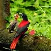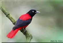 朱鹂:中等鸟类,体长23-28厘米。雄鸟绛紫红色,头、上胸及翼黑色。雌鸟上背及背部深灰色,尾覆羽及尾绛紫红色,腹部及下胸白而密布黑色纵纹。与鹊色鹂幼鸟的区别在上背灰色较深,下体白色较少且纵纹较粗。…全部>>
