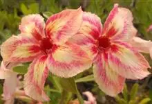 沙漠玫瑰 Roem. & Schult.),别名天宝花、阿拉伯沙漠玫瑰、索马里沙漠玫瑰等,为夹竹桃科沙漠玫瑰属的一种多肉灌木或小乔木植物。其树干肿胀,茎干光滑,白绿色或灰白色,…全部>>