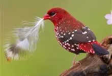 红梅花雀小型鸟类,体长9-10厘米。雄鸟通体朱红色,背、肩、胸等满布白色小斑点,两翅和尾黑褐色均具白色端斑,嘴红色,脚蜡黄色。雌鸟上体淡褐色或赭褐色,翅上中覆羽、大覆羽和内侧飞羽末端具白色斑点,…全部>>