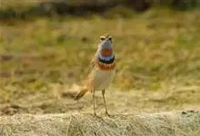 蓝点颏亦称“蓝喉歌鸲”,通称蓝靛颏儿。身体大小和麻雀相似,体长12-13厘米,体重17-18克。头部、上体主要为土褐色。眉纹白色。尾羽黑褐色,基部栗红色。颏部、喉部辉蓝色,下面有黑色横纹。下体白色。…全部>>