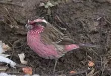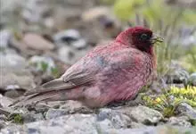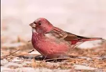 藏朱雀:全长约17-18厘米。雄鸟头部深红色具光辉,喉部暗红色具白色点斑;背部灰白色,各羽具玫瑰红色羽端,形成许多斑纹;腰部淡玫瑰红色;翅暗褐色,沾灰白,羽端沾玫瑰红或灰白色;尾暗棕色,端缘玫瑰红色…全部>>