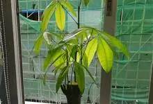 瓜栗 Walp. ),俗称发财树,木棉科小乔木,高4-5米,树冠较松散,幼枝栗褐色,无毛。小叶具短柄或近无柄。花单生枝顶叶腋;花梗粗壮,被黄色星状茸毛,脱落;萼杯状,近革质;花瓣淡黄绿色,狭披针形…全部>>