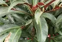 朱砂根是报春花科紫金牛属植物,又名铁凉伞、红铜盘、百两金、大罗伞、开喉箭等,为常绿小灌木,高1~2米,茎粗壮,无毛,除侧生特殊花枝外,无分枝,叶片革质或坚纸质,椭圆形、椭圆状披针形至倒披针形,…全部>>