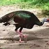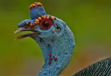 眼斑吐绶鸡:是火鸡科的两种鸟类之一。体型比普通火鸡略小些,体长1米左右,体重2.4-5.4千克,雄性比雌性略大,长得很特别,蓝色的秃脑袋上冒出几个橙黄色的疙瘩。但是它羽色艳丽,身体呈铜色及绿色。…全部>>