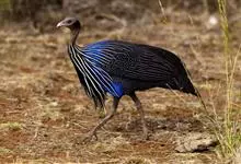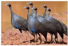 鹫珠鸡:是珠鸡科中体形最大的一种,因头颈部像兀鹫而得名。雌雄羽色相似,为黑色基底上遍布白色点斑,如同珍珠。以各种植物的种子和小型动物为食。走禽。体结实,喙短,呈圆锥形,适于啄食植物种子;脚强健,具锐爪,…全部>>