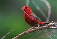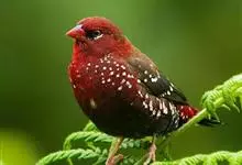 红梅花雀小型鸟类,体长9-10厘米。雄鸟通体朱红色,背、肩、胸等满布白色小斑点,两翅和尾黑褐色均具白色端斑,嘴红色,脚蜡黄色。雌鸟上体淡褐色或赭褐色,翅上中覆羽、大覆羽和内侧飞羽末端具白色斑点,…全部>>