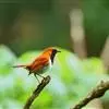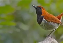 琉球歌鸲是鹟科、歌鸲属小型鸟类,体长约14厘米。雄鸟上体暗橙色,颏、喉、胸黑色。其余下体白色。雌鸟亦为橙色,颏、喉白色,其余下体污白色而缀有灰色。嘴峰黑褐色或褐色,脚肉色或肉黄色。…全部>>