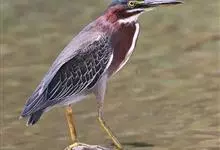 绿鹭:是鹳形目鹭科绿鹭属鸟类。体型小,头顶黑,枕冠亦黑色,上体蝉灰绿色,下体两侧银灰色;前额至后枕及冠羽墨绿色,眼后有一白斑,颊纹黑色;颚纹白色,后颈、颈侧和体侧烟灰色;背部披灰绿色矛状长羽,…全部>>
