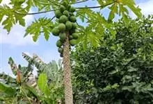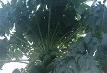 番木瓜,番木瓜科番木瓜属的常绿软木质小乔木,高达10米,具有乳汁;茎不分枝或有时于损伤处分枝;叶大且聚生于茎顶,近似盾形,叶柄中空;花单性或两性,有些品种雄株偶尔生两性花或雌花,…全部>>