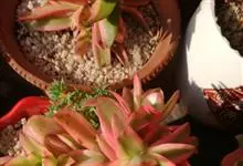 叶子表面宽厚,富肉质感且带有磨纱质感,看像石头质地;开红色小花,生于植株顶部,倒伞形密生,形状像花球一样。 全部>>