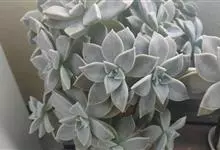胧月 E.Walther)是景天科,风车草属多肉植物,常绿蔓生亚灌木,叶肥厚无柄,灰蓝色,阳光充足时呈粉红色,叶片枝顶簇生成莲座状,乳白色,花冠5裂,上有紫红色斑点,雄蕊两轮排列,花药鲜红色,…全部>>