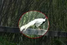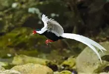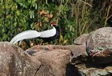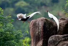白鹇,是鸡形目雉科鹇属的一种留鸟。雄鸟上体白色并具黑色纹,下体黑色,头顶具黑色长羽冠,尾白而长;雌鸟体型较小,以橄榄褐色为主,下体具白色或皮黄色细纹;虹膜褐色,眼周具红色裸皮,喙黄色,脚鲜红色。…全部>>