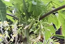 番木瓜,番木瓜科番木瓜属的常绿软木质小乔木,高达10米,具有乳汁;茎不分枝或有时于损伤处分枝;叶大且聚生于茎顶,近似盾形,叶柄中空;花单性或两性,有些品种雄株偶尔生两性花或雌花,…全部>>