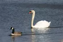 扁嘴天鹅:体长90-115厘米,体羽白色,羽端黑色,在飞行时则很明显。雁喙和脚红色。栖息于茂密的沼泽及湖泊,主要吃草及水生植物,也会吃蚌类及鱼类。分布于南美洲,…全部>>