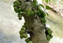 大果榕是桑科榕属的小乔木,株高可达10米;幼枝被柔毛;叶互生,宽卵状心形或近圆形;雄花无梗、匙形、花丝长,雌花生于雌株榕果内,子房白色;榕果簇生于树干基部或老茎短枝上、扁球形或陀螺形,…全部>>