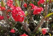 虎刺梅:别称铁海棠,是蔓生灌木植物。茎多分枝,长60-100厘米,直径5-10毫米,具纵棱,密生硬而尖的锥状刺,刺长1-1.5厘米,直径0.5-1.0 毫米,常呈3-5列排列于棱脊上,呈旋转。叶互生…全部>>